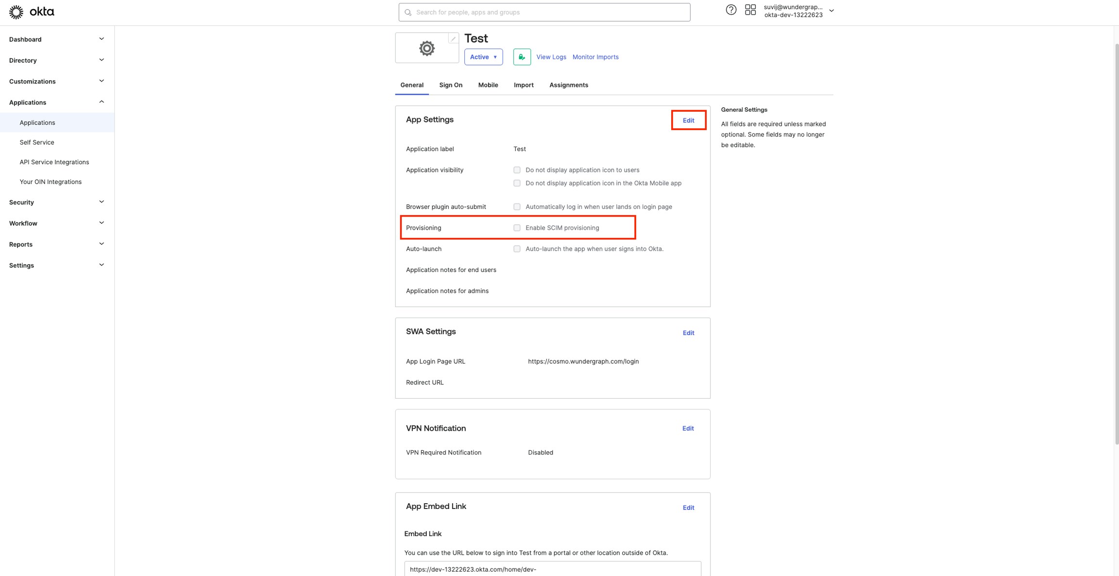 Navigate to the provisioning tab of the app created on okta, then click on Edit.
