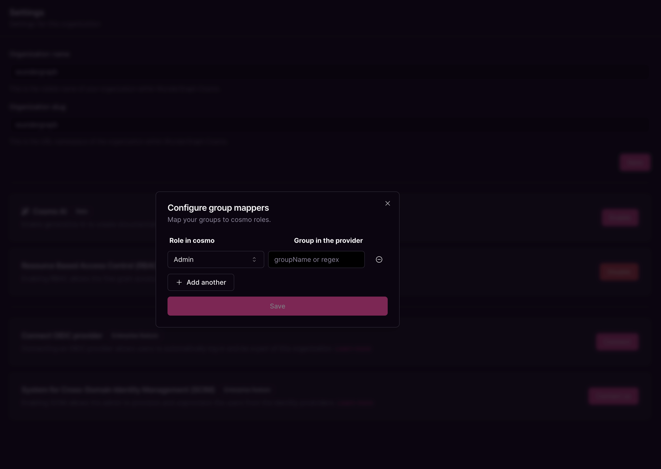 Configure the mapping between the roles in Cosmo and the user roles in Auth0. The field Group in the provider can be populated with the name of the role or a regex to match the user roles. Once all the mappers are configured, click on Save.